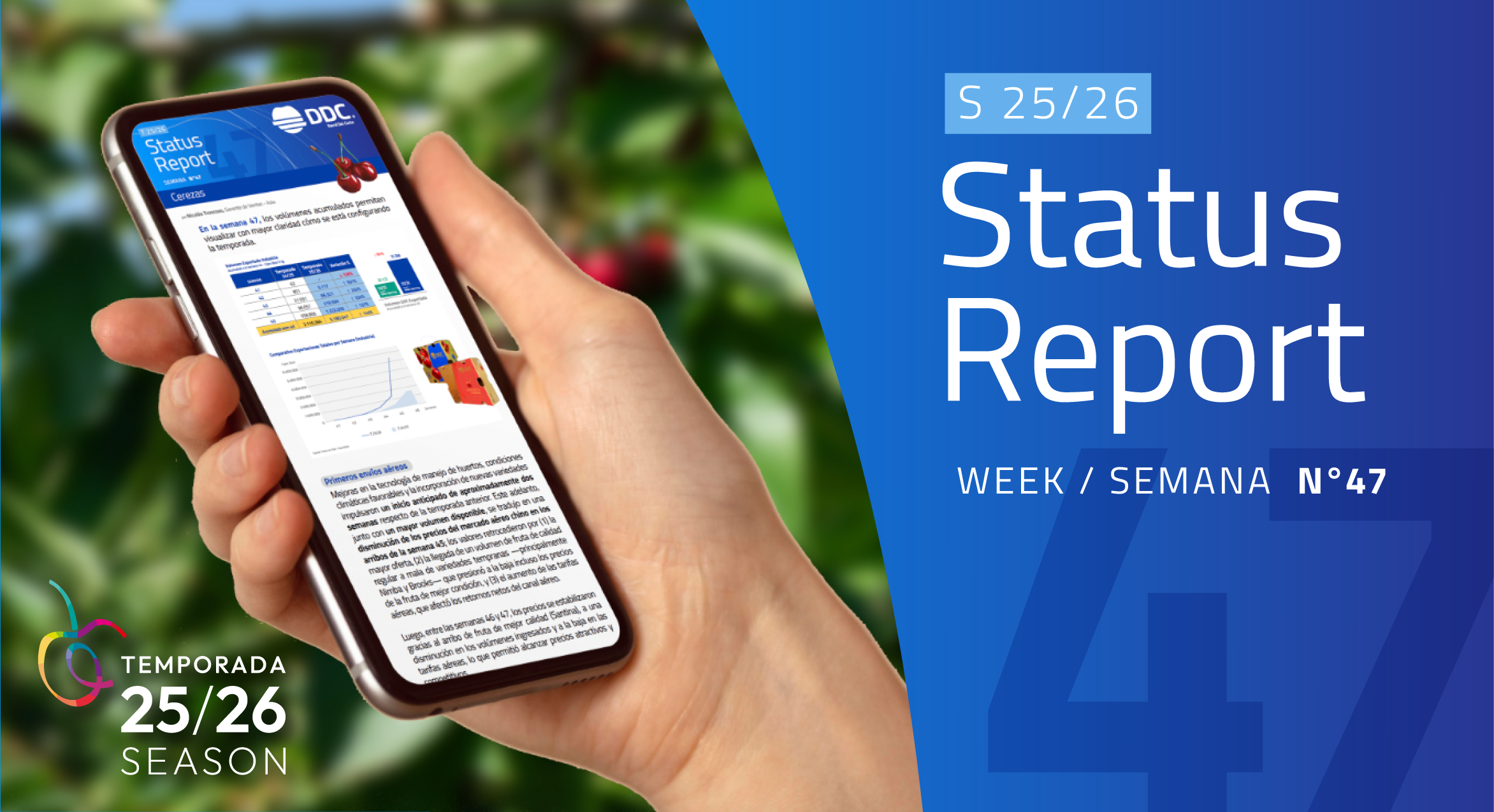 We invite you to review the first edition of our 25/26 DDC Status Report, corresponding to Week 47. This report outlines the current progress of our cherry campaign, highlighting key developments, challenges, and projections to date.